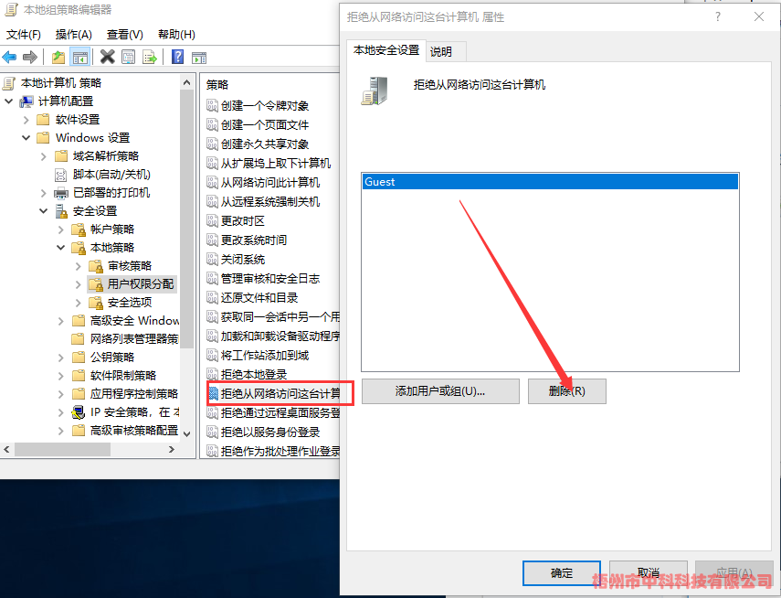 (1)、計(jì)算機(jī)配置->Windows設(shè)置->安全設(shè)置->本地策略->用戶權(quán)限分配->拒絕從網(wǎng)絡(luò)訪問這臺(tái)計(jì)算機(jī)->刪除Guest